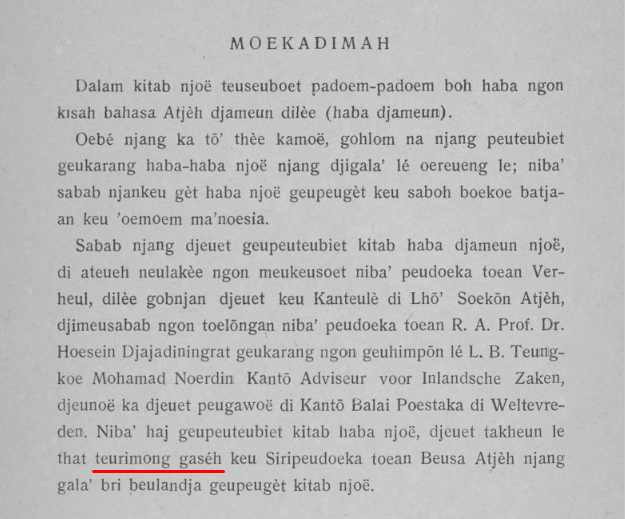 Teungku Mohamad Nurdin dalam buku Boengong Sitoengkoj (1930) menulis teurimong gaséh.